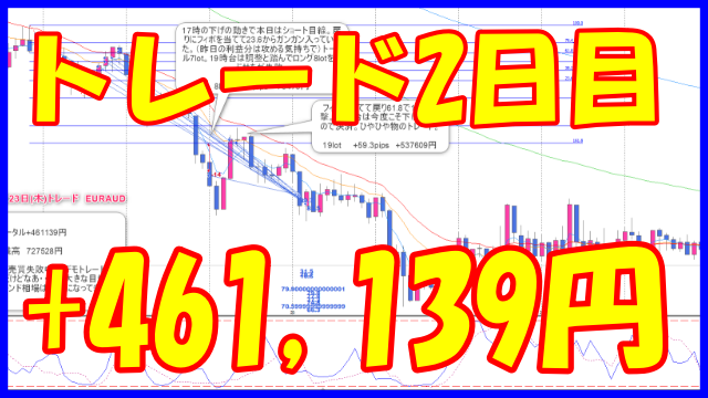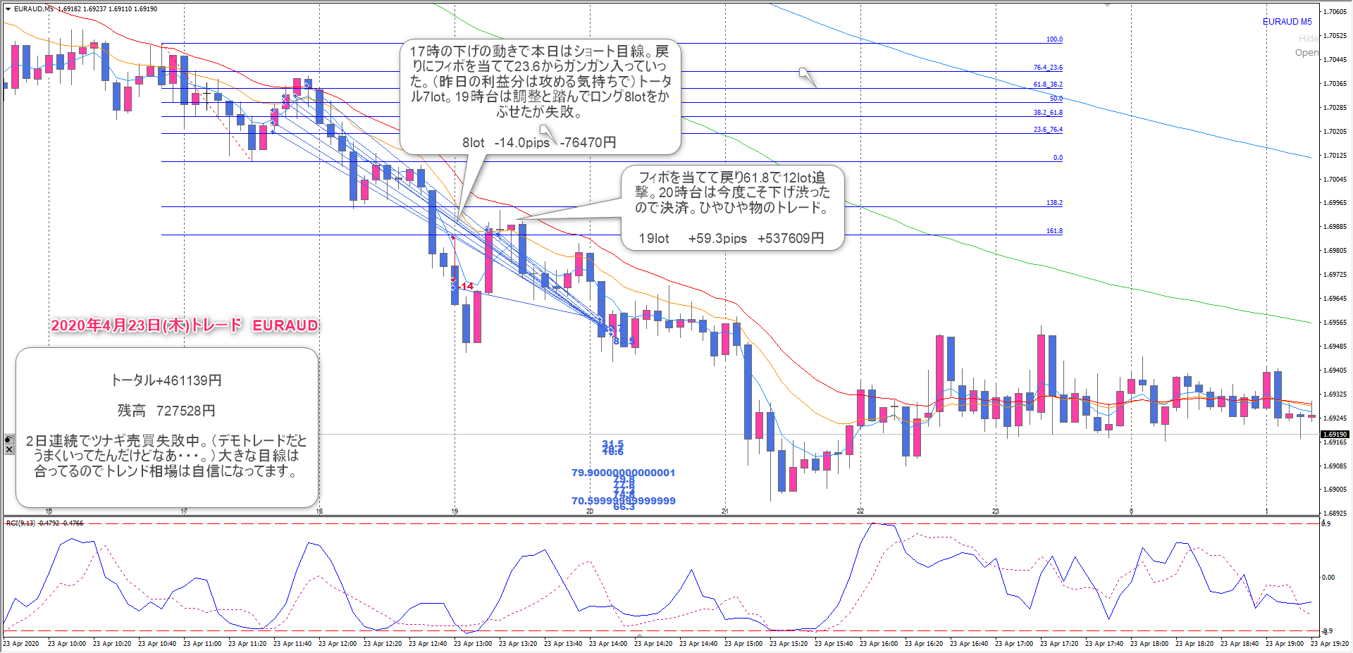 通貨はEURAUD。17時過ぎに帰宅でき、17時スタートの勢いを確認できました。下げの動きでショート目線。戻りにフィボを当てて23.6からガンガン入っていきました。(昨日の利益分は攻める気持ちで)